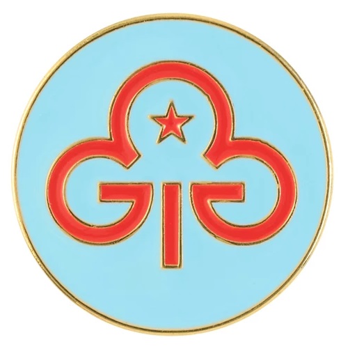 Rainbow promise badge (light blue) to represent her commitment to guiding.
